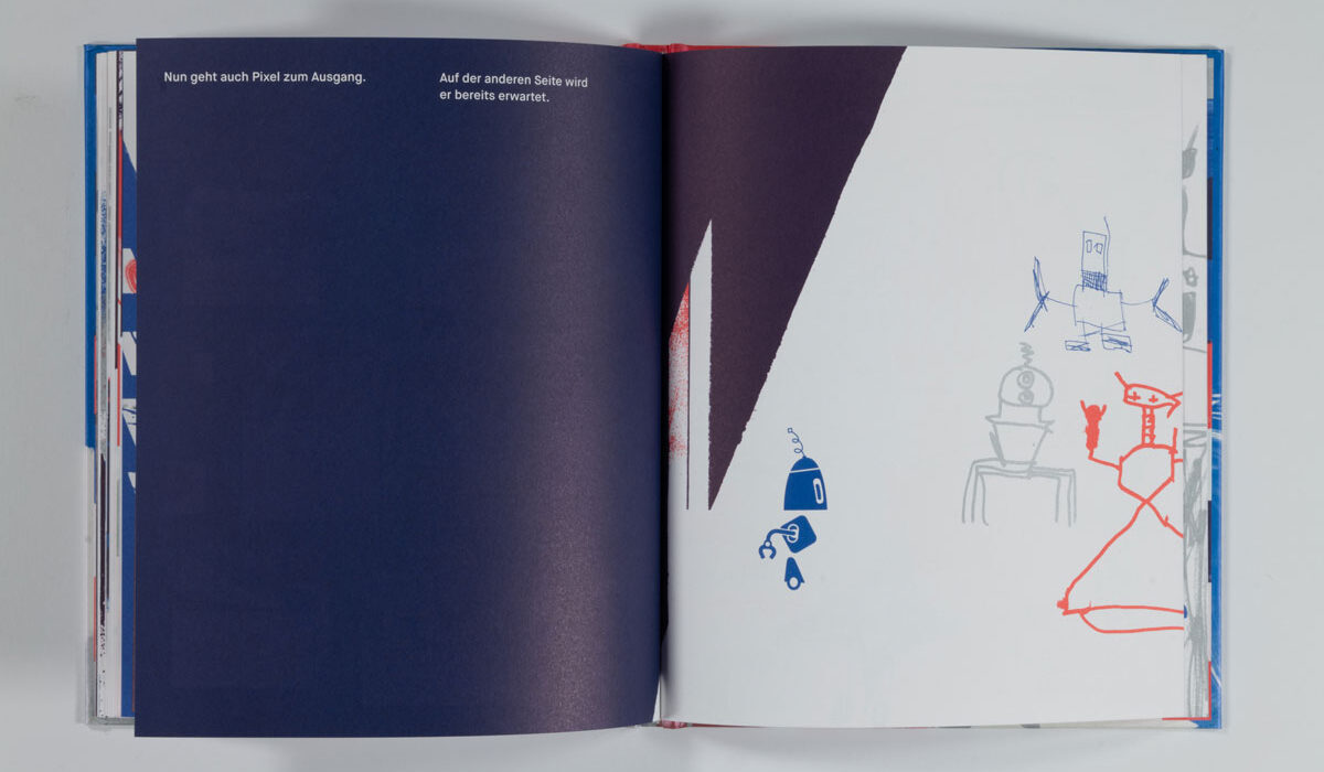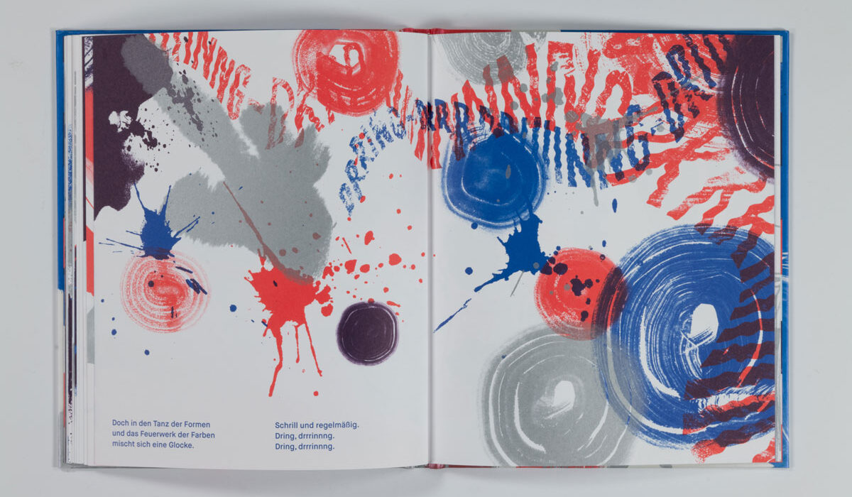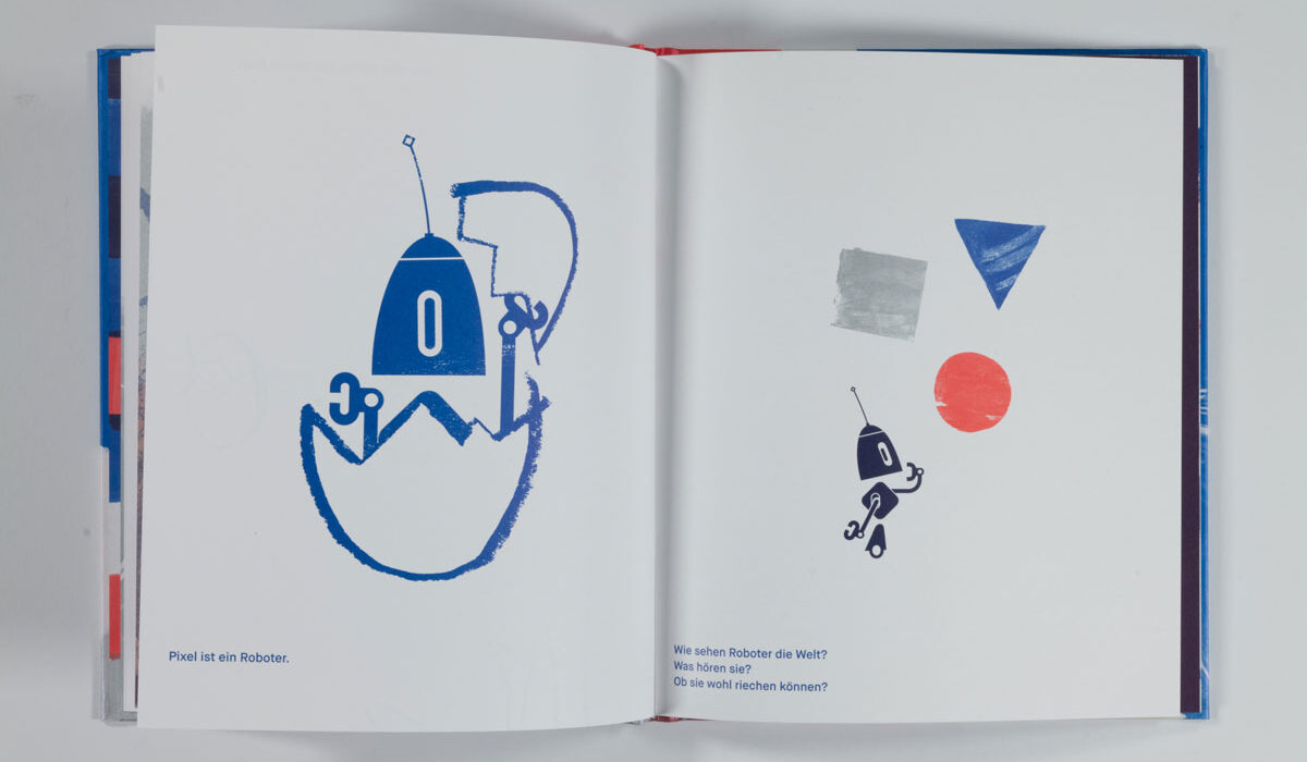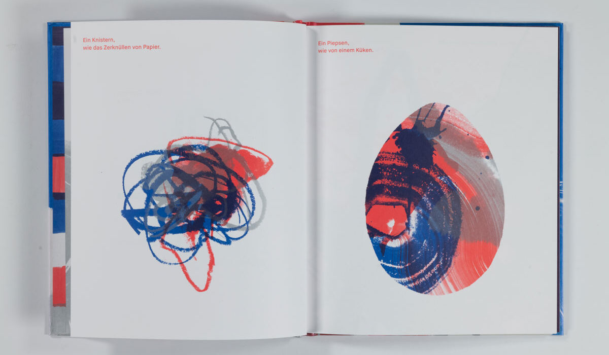 MAL PIXEL MAL Reto Crameri Text: Kirsten Winderlich Repros: Sophia Ashraf, Lucia Leonhardt Fotos: Sophia Ashraf, Helen Naujoks Vektorgenerierte Formenspiele treffen auf experimentelles Action-Painting mit kurvenden Endlosspuren von Pinselstrichen. Landschaften wie (roll)treppenartige Wegenetze, mit Hilfe von Spritztechnik zum Erscheinen gebracht, ziehen in den Bann und lassen uns in die komplementäre rot- und blaufarbene Roboter-Welt eintauchen. Zahlreiche Konstruktionen aus Varianten geometrischer Grundformen wie Linien und Pfaden geben jedem Einzelnen Gestalt und Charakter. Ein Mapping von Geräuschen, die so vielfältig sind, »wie die Roboter selbst«, begleiten das Spektakel: »KWIIIEEE – KWIIIEE« […] »SCHT – SCHT« […] »PIEP-PIEP-PIEP« […]. Da gibt es z.B. Roboter mit den Namen »Tornado«, »Jein« oder »XXL« und viele andere, und eben auch »Pixel«, den Protagonisten, »Ein Meister im Malen«. Mit der Rezeption des Bilderbuches nehmen wir Teil, wie Pixel pflichtbewusst versucht, seinen Aufträgen gerecht zu werden, sich gleichzeitig vom eigenen Bildermachen mitreißen lässt und sich somit mitten »ins tosende Bild« stürzt. Was passiert hier? Eine auktoriale Erzählstimme, den Brecht‘schen Verfremdungseffekt anwendend, fordert uns auf zu reflektieren: »Ist es ein gutes Bild?« […] »Liegt die Verantwortung vielleicht im Inneren?« […] »Können Roboter Spaß haben?« […]. Die Fragen bleiben offen, denn schon schreiten die Kontrollmodule ein und fliegen wie einäugige […] Read More › Schaut, ein Elefant!