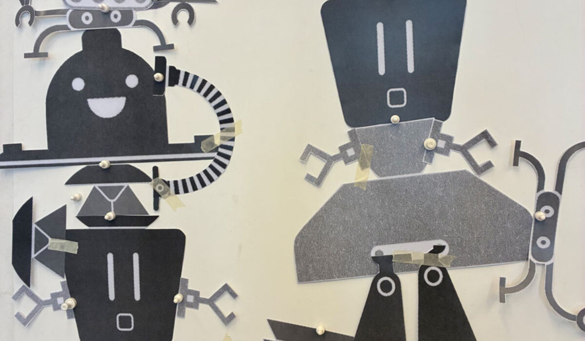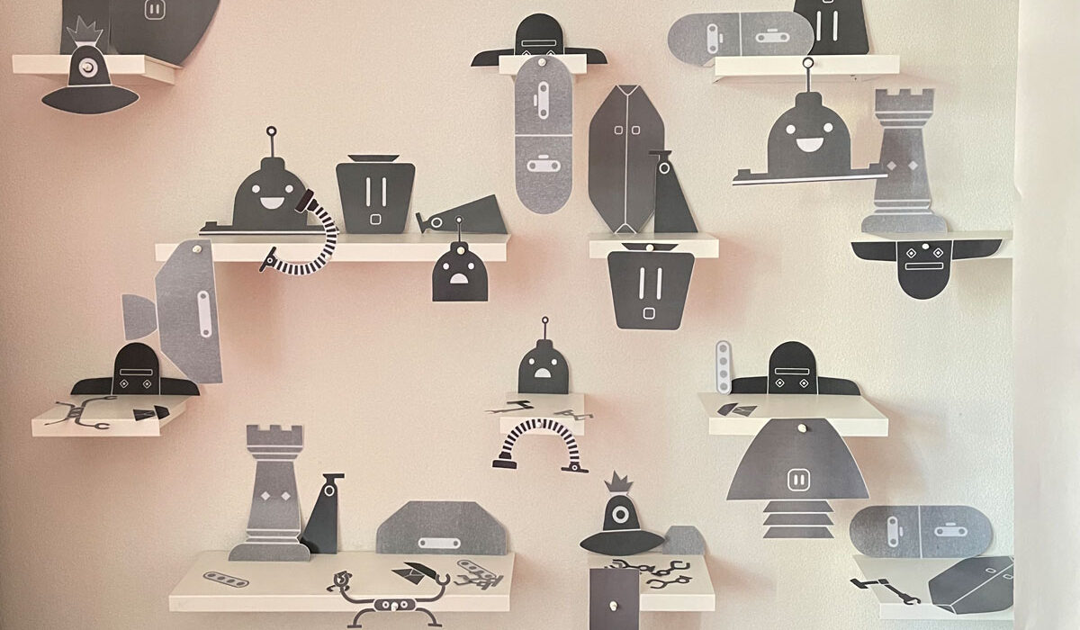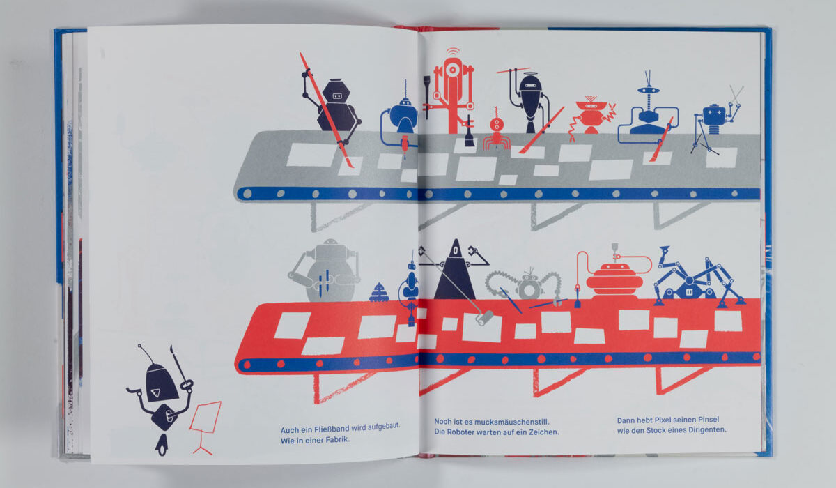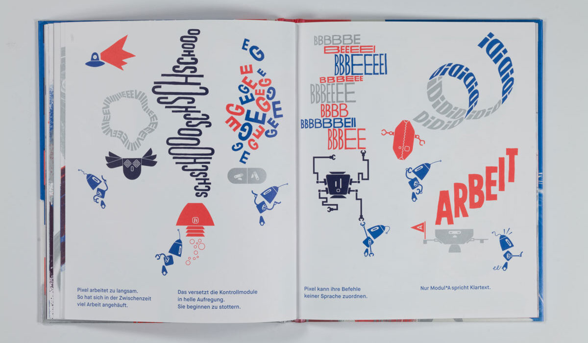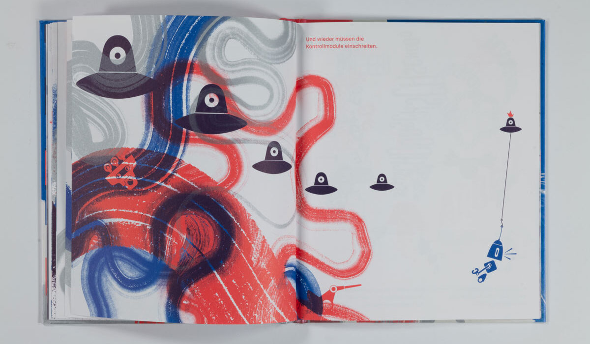 MAL PIXEL MAL Reto Crameri Text: Kirsten Winderlich Repros: Sophia Ashraf, Lucia Leonhardt Fotos: Sophia Ashraf, Helen Naujoks Vektorgenerierte Formenspiele treffen auf experimentelles Action-Painting mit kurvenden Endlosspuren von Pinselstrichen. Landschaften wie (roll)treppenartige Wegenetze, mit Hilfe von Spritztechnik zum Erscheinen gebracht, ziehen in den Bann und lassen uns in die komplementäre rot- und blaufarbene Roboter-Welt eintauchen. Zahlreiche Konstruktionen aus Varianten geometrischer Grundformen wie Linien und Pfaden geben jedem Einzelnen Gestalt und Charakter. Ein Mapping von Geräuschen, die so vielfältig sind, »wie die Roboter selbst«, begleiten das Spektakel: »KWIIIEEE – KWIIIEE« […] »SCHT – SCHT« […] »PIEP-PIEP-PIEP« […]. Da gibt es z.B. Roboter mit den Namen »Tornado«, »Jein« oder »XXL« und viele andere, und eben auch »Pixel«, den Protagonisten, »Ein Meister im Malen«. Mit der Rezeption des Bilderbuches nehmen wir Teil, wie Pixel pflichtbewusst versucht, seinen Aufträgen gerecht zu werden, sich gleichzeitig vom eigenen Bildermachen mitreißen lässt und sich somit mitten »ins tosende Bild« stürzt. Was passiert hier? Eine auktoriale Erzählstimme, den Brecht‘schen Verfremdungseffekt anwendend, fordert uns auf zu reflektieren: »Ist es ein gutes Bild?« […] »Liegt die Verantwortung vielleicht im Inneren?« […] »Können Roboter Spaß haben?« […]. Die Fragen bleiben offen, denn schon schreiten die Kontrollmodule ein und fliegen wie einäugige […] Read More › Schaut, ein Elefant!