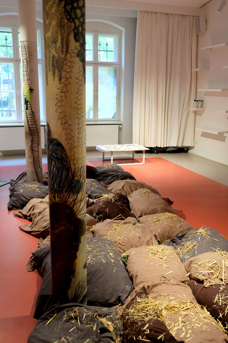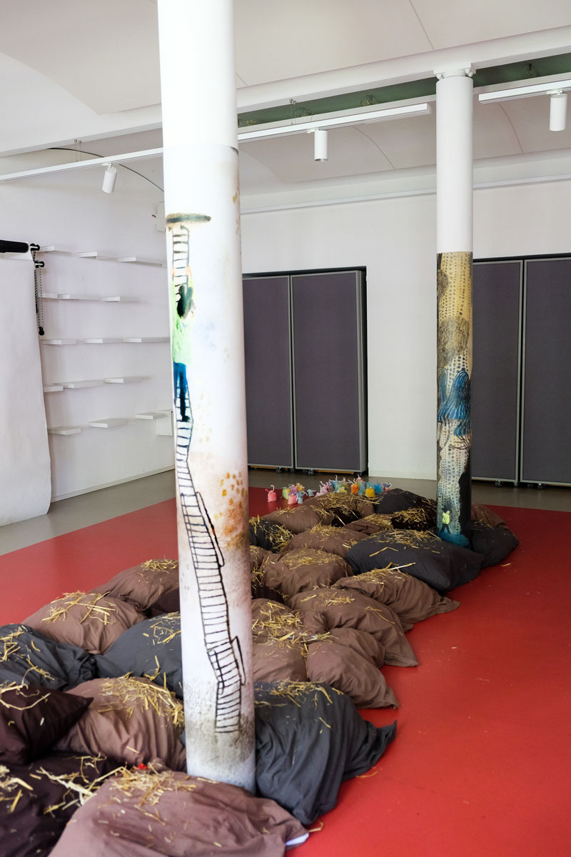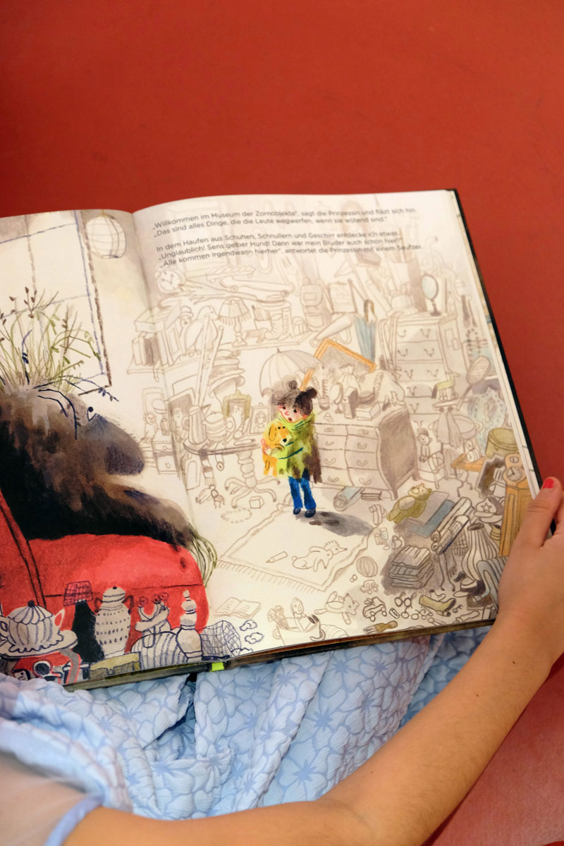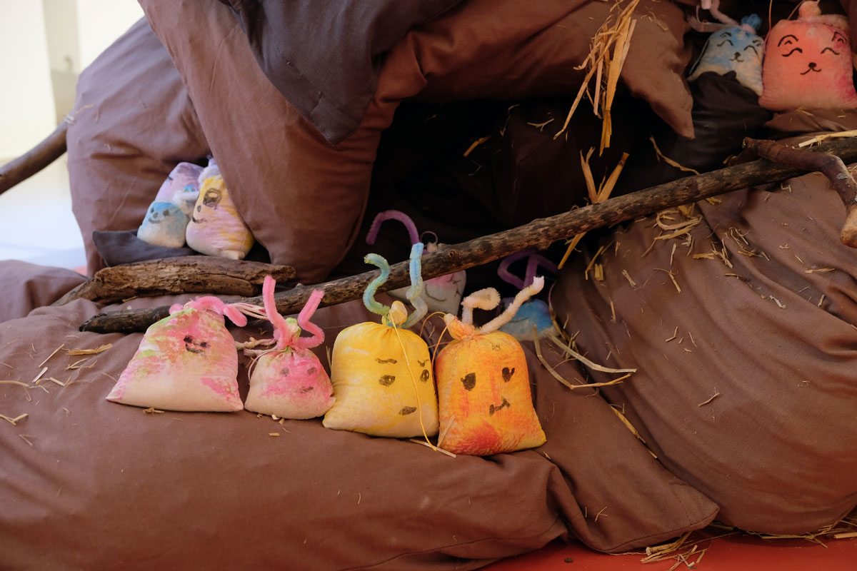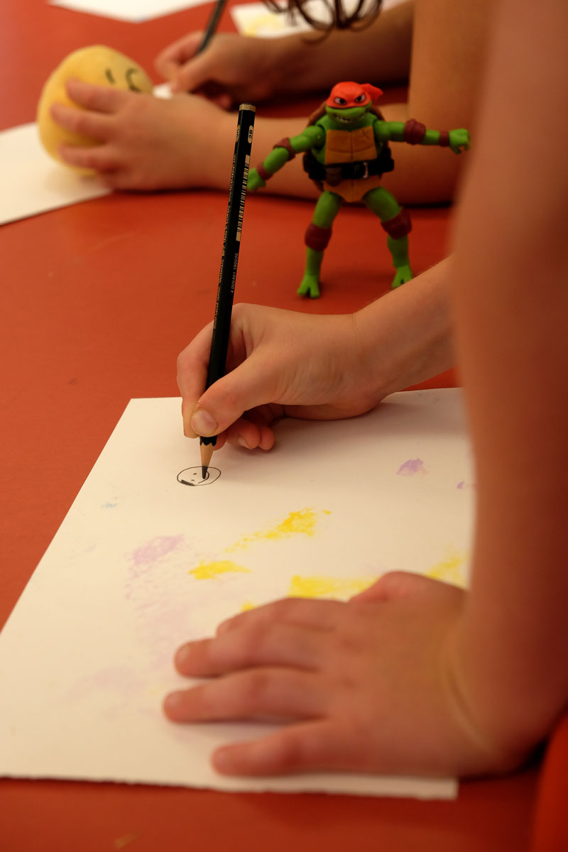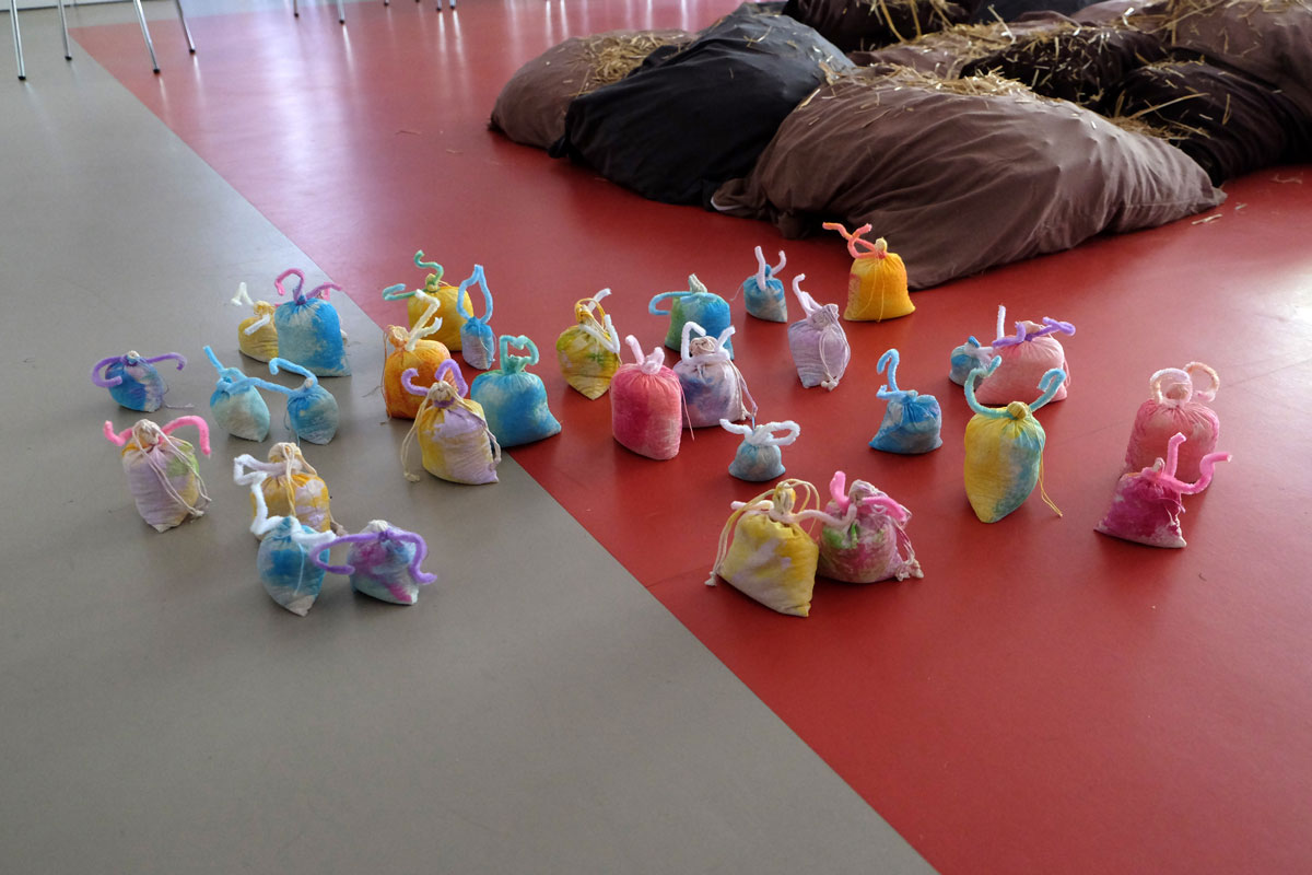 Doch bevor die Kinder die Prinzessin bauen und begrüßen konnten, gruben sie in »Schlammland« nach weggeworfenem Spielzeug und spürten den einzelnen Geschichten der verschiedenen Fundstücke schreibend und zeichnend nach. Flankiert wird dieser Prozess von Bildern aus dem Bilderbuch, die, angebracht an zwei zentralen Säulen, Yuki auf ihrem Abstieg ins »Schlammland« wie den »Ärgerwald« in den Raum holen. Als Träger für ihre Texte und Bilder steht den Kindern Papier mit pastellfarbenen Spuren, die während der Produktion der »Müffelinos« zufällig entstanden sind, zur Verfügung. Das Besondere dieser bemerkenswerten Gesellschaft ist, dass sie zwar unangenehm stinken, aber dennoch während der Kanalisation der Gefühle, die in »Schlammland« durchlebt wird, unterstützen können. Also warum ihre »Hinterlassenschaften« nicht für die Hervorlockung der Gefühle der Kinder wirksam werden lassen? Die Papiere, gefächert auf einem Tisch ausgelegt, sind mit einer Schicht gestreuter weicher Bleistifte versehen. Die Anordnung der gespitzten Stifte ist dabei als Referentiell zur Streuung des Strohs auf den Kissen zu verstehen. Entsprechend der Ästhetik des Bilderbuches, die auf Kontraste und Gegensätze baut, ist das »Schlammland« in der grund_schule der künste nicht matschig-triefend, sondern weich-gepolstert. Das Stroh, mit dem die Kissen gefüttert sind, lässt jedoch erahnen, dass die Unterwelt der Gefühle, in die Yuki nur zögerlich hinabsteigt, »pieksen« oder einfach nur schmerzen kann. Und an diesem wunden Punkt knüpfen wir am zweiten Workshop-Tag an. Die Kinder wurden nämlich eingeladen, eigene »Zornobjekte« mitzubringen und zu erforschen. Im anschließenden Austausch mit Beatrice Alemagna stieß ihr Furor dabei auf ein Gegenüber, das ihnen Mut machte, wie Yuki, zu ihren Gefühlen »hinabzusteigen«, und sich mit ihnen – seien sie im ersten Moment noch so groß und erdrückend – anzufreunden.