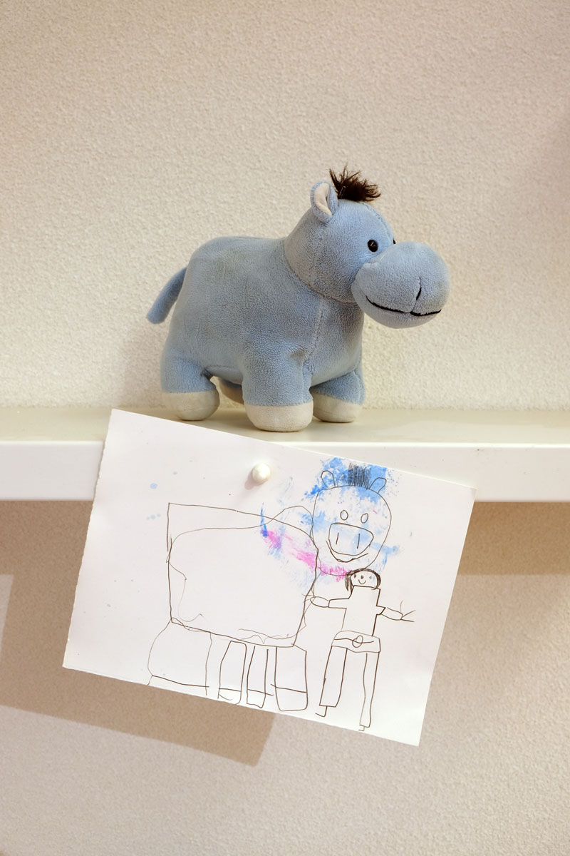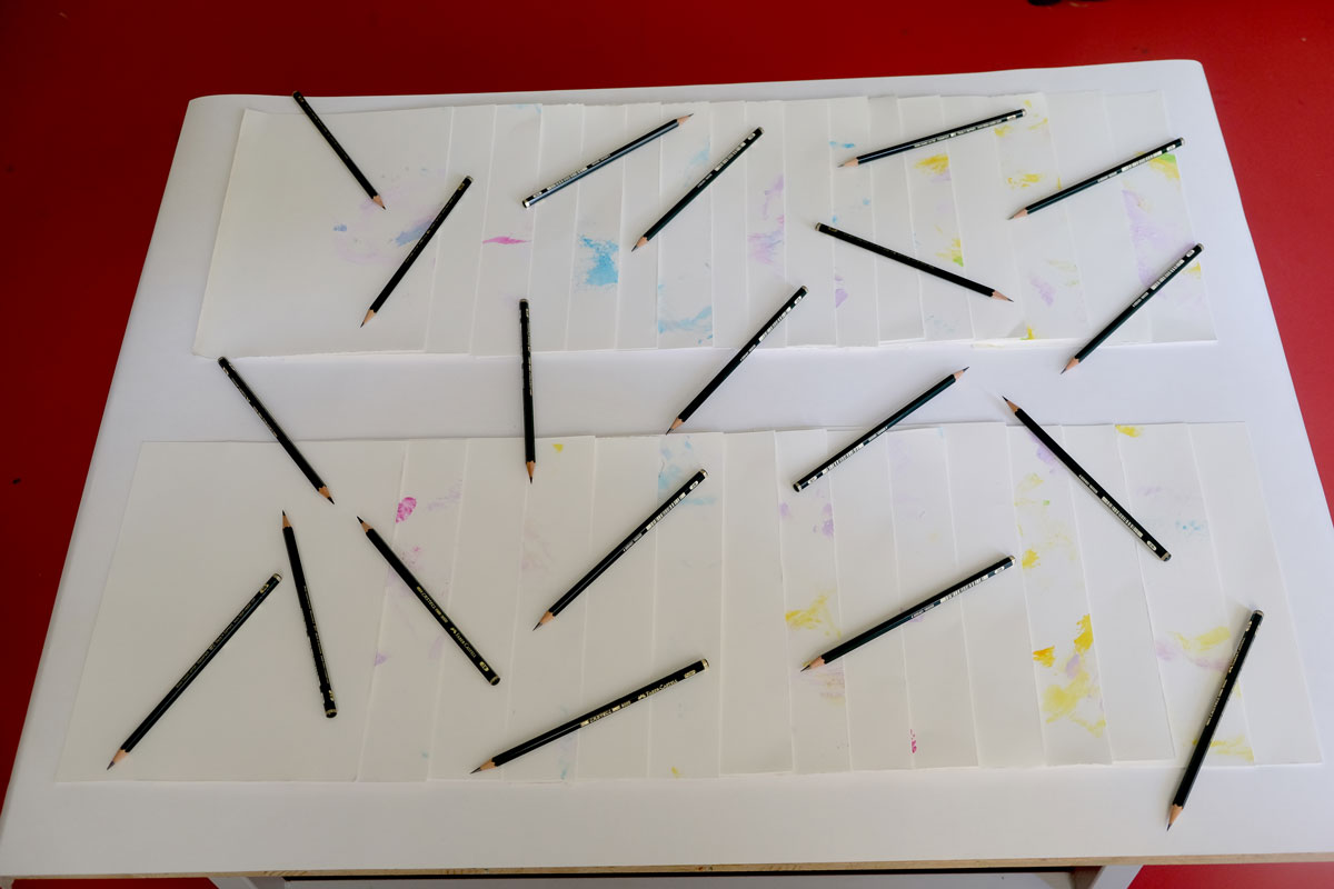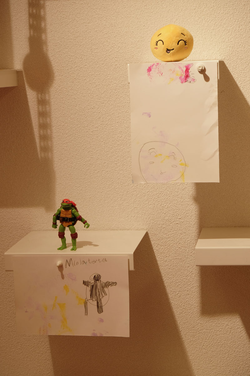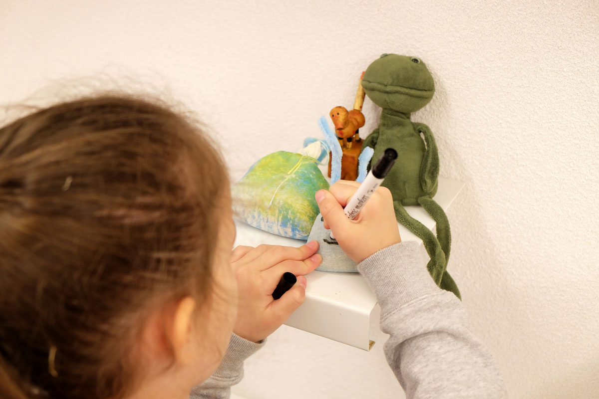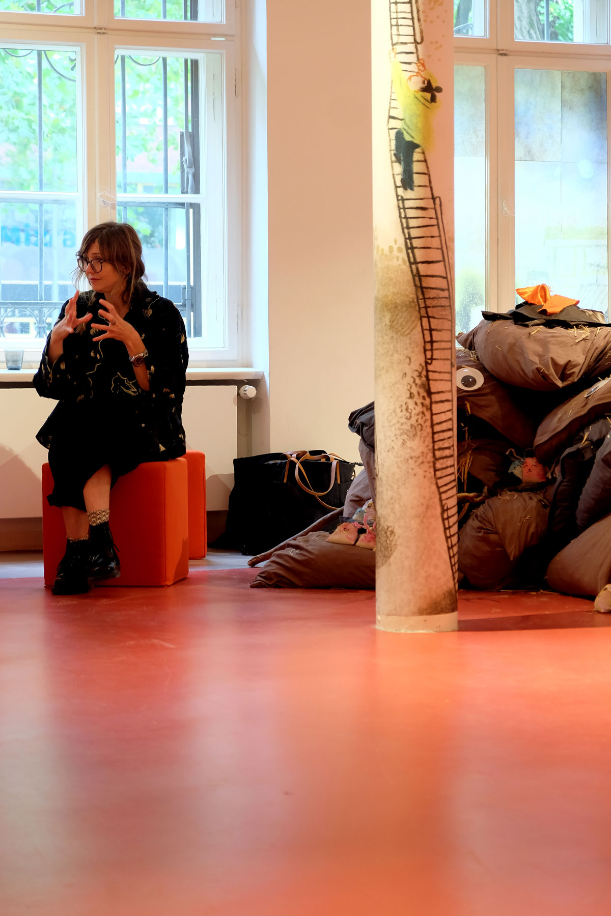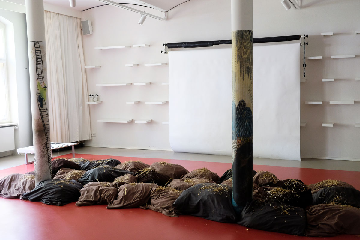 Doch bevor die Kinder die Prinzessin bauen und begrüßen konnten, gruben sie in »Schlammland« nach weggeworfenem Spielzeug und spürten den einzelnen Geschichten der verschiedenen Fundstücke schreibend und zeichnend nach. Flankiert wird dieser Prozess von Bildern aus dem Bilderbuch, die, angebracht an zwei zentralen Säulen, Yuki auf ihrem Abstieg ins »Schlammland« wie den »Ärgerwald« in den Raum holen. Als Träger für ihre Texte und Bilder steht den Kindern Papier mit pastellfarbenen Spuren, die während der Produktion der »Müffelinos« zufällig entstanden sind, zur Verfügung. Das Besondere dieser bemerkenswerten Gesellschaft ist, dass sie zwar unangenehm stinken, aber dennoch während der Kanalisation der Gefühle, die in »Schlammland« durchlebt wird, unterstützen können. Also warum ihre »Hinterlassenschaften« nicht für die Hervorlockung der Gefühle der Kinder wirksam werden lassen? Die Papiere, gefächert auf einem Tisch ausgelegt, sind mit einer Schicht gestreuter weicher Bleistifte versehen. Die Anordnung der gespitzten Stifte ist dabei als Referentiell zur Streuung des Strohs auf den Kissen zu verstehen. Entsprechend der Ästhetik des Bilderbuches, die auf Kontraste und Gegensätze baut, ist das »Schlammland« in der grund_schule der künste nicht matschig-triefend, sondern weich-gepolstert. Das Stroh, mit dem die Kissen gefüttert sind, lässt jedoch erahnen, dass die Unterwelt der Gefühle, in die Yuki nur zögerlich hinabsteigt, »pieksen« oder einfach nur schmerzen kann. Und an diesem wunden Punkt knüpfen wir am zweiten Workshop-Tag an. Die Kinder wurden nämlich eingeladen, eigene »Zornobjekte« mitzubringen und zu erforschen. Im anschließenden Austausch mit Beatrice Alemagna stieß ihr Furor dabei auf ein Gegenüber, das ihnen Mut machte, wie Yuki, zu ihren Gefühlen »hinabzusteigen«, und sich mit ihnen – seien sie im ersten Moment noch so groß und erdrückend – anzufreunden.