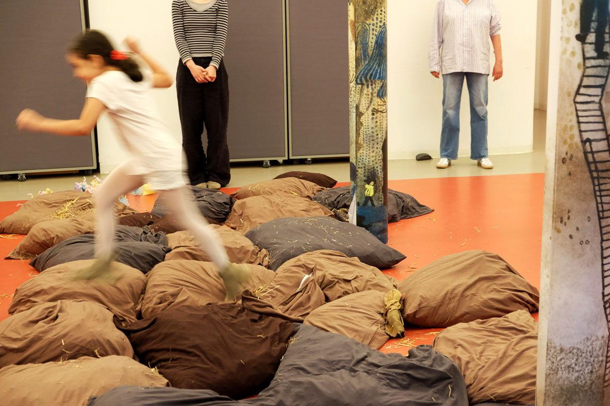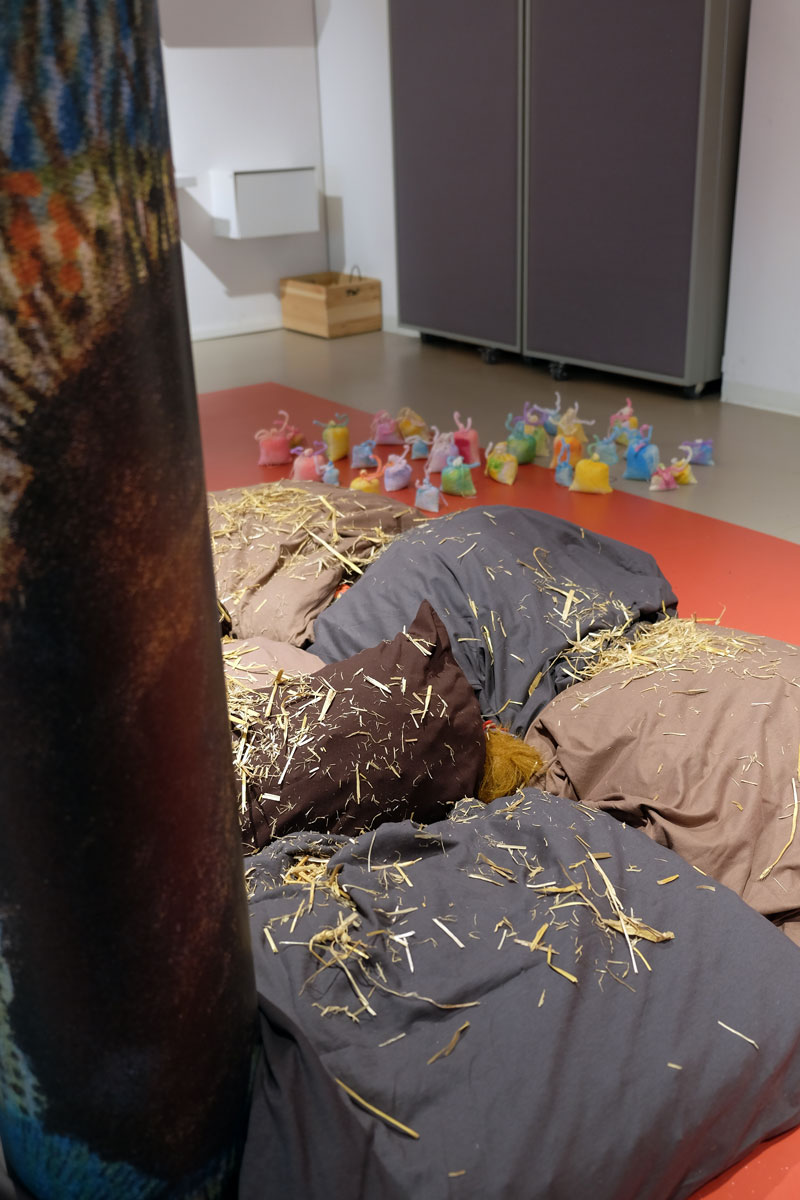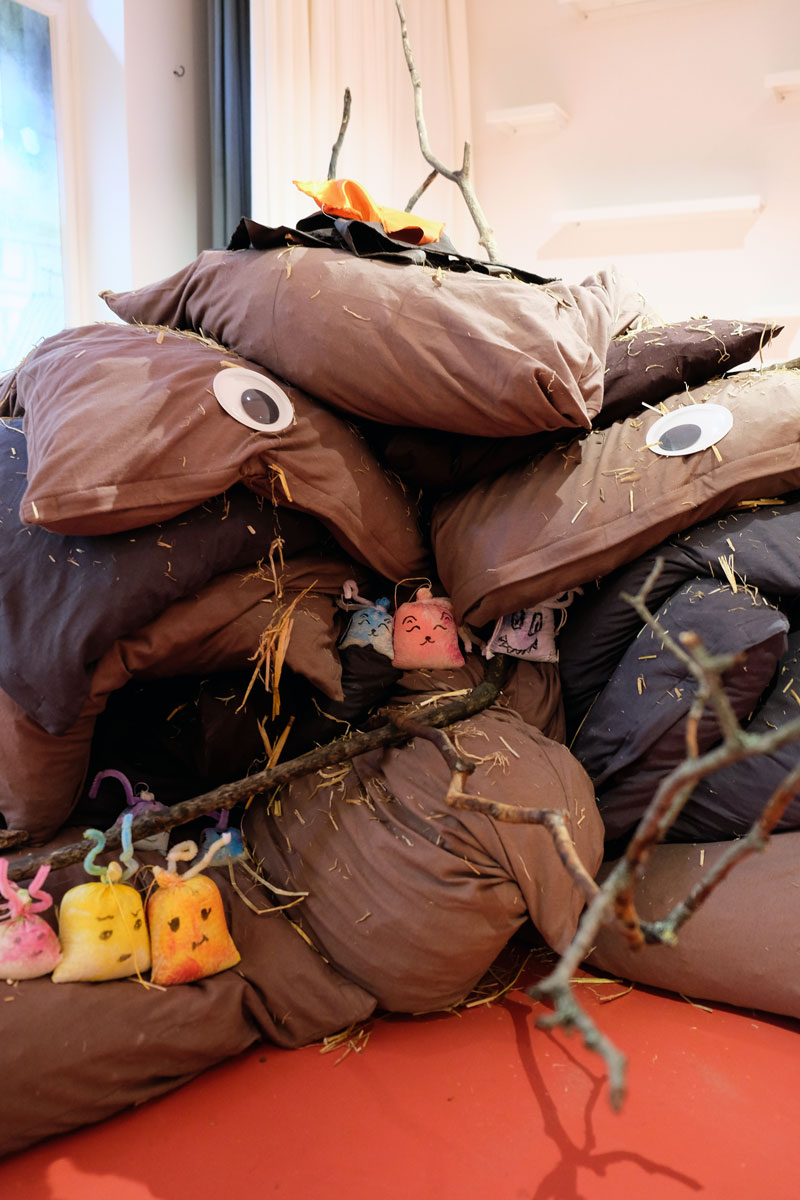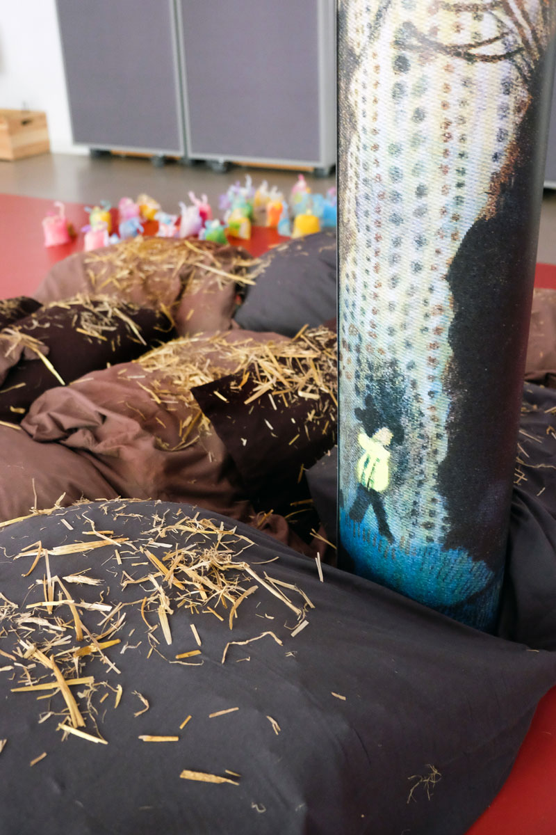 Kissen über Kissen türmen sich in die Höhe. Der Berg aus Braun-, Erd- und Schlammtönen knistert lautlos. Tatsächlich lugen hier und da trockene und ausgedroschene Halme der Gerstenpflanze aus den weichen Fugen der Textilinstallation. Beim Näherkommen lassen Stöckchen wie diverse Wollreste und Stofffetzen Arme und Haarschopf erkennen. Es gibt keinen Zweifel: Das amorphe Gegenüber ist nichts weniger als Ihre Hoheit Matsch! Oder die Prinzessin aus Schlammland, die die Protagonistin Yuki durch eine Art Unterwelt begleitet und damit unterstützt, mit ihren Gefühlen umzugehen – ohne Scham.