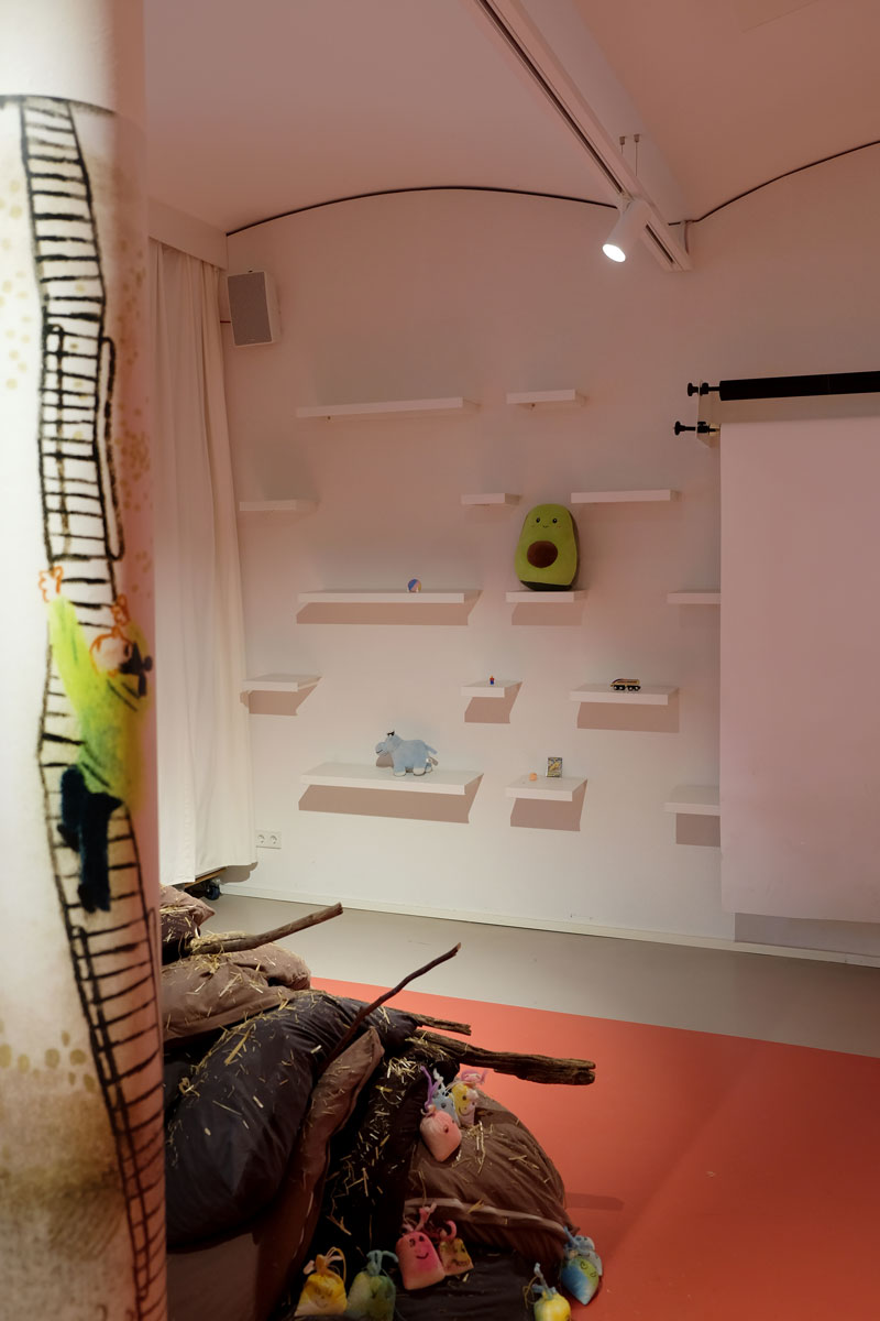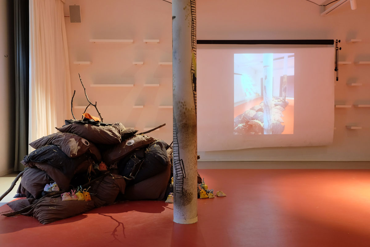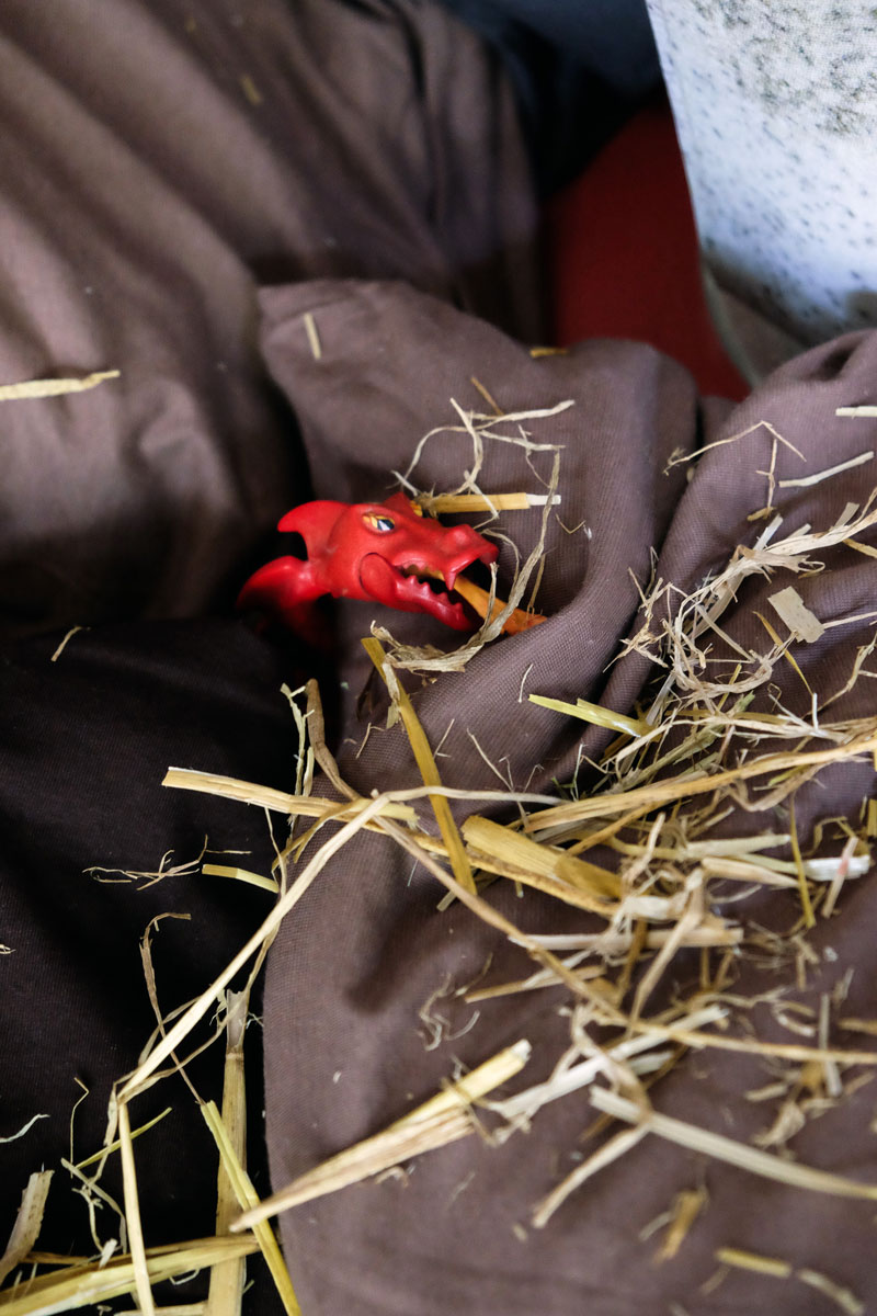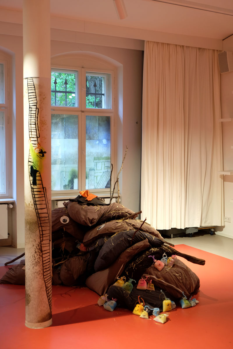 Kissen über Kissen türmen sich in die Höhe. Der Berg aus Braun-, Erd- und Schlammtönen knistert lautlos. Tatsächlich lugen hier und da trockene und ausgedroschene Halme der Gerstenpflanze aus den weichen Fugen der Textilinstallation. Beim Näherkommen lassen Stöckchen wie diverse Wollreste und Stofffetzen Arme und Haarschopf erkennen. Es gibt keinen Zweifel: Das amorphe Gegenüber ist nichts weniger als Ihre Hoheit Matsch! Oder die Prinzessin aus Schlammland, die die Protagonistin Yuki durch eine Art Unterwelt begleitet und damit unterstützt, mit ihren Gefühlen umzugehen – ohne Scham.