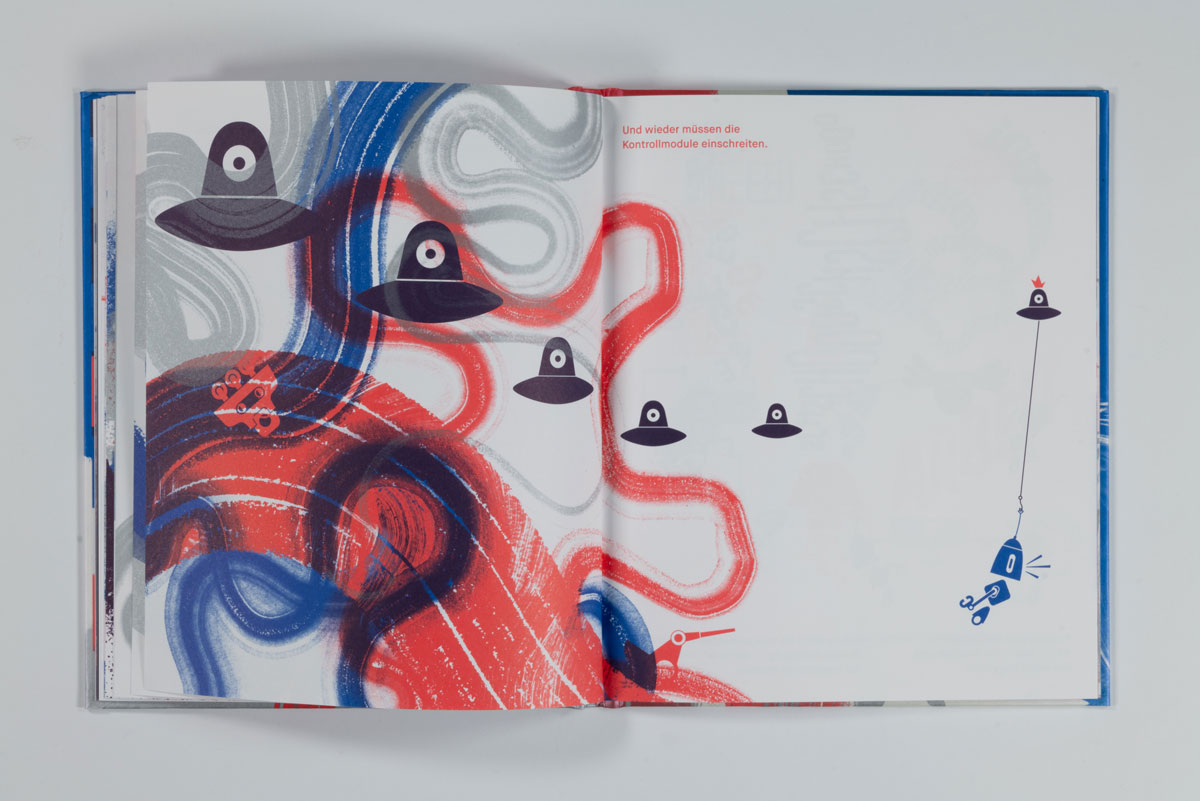 Vektorgenerierte Formenspiele treffen auf experimentelles Action-Painting mit kurvenden Endlosspuren von Pinselstrichen. Landschaften wie (roll)treppenartige Wegenetze, mit Hilfe von Spritztechnik zum Erscheinen gebracht, ziehen in den Bann und lassen uns in die komplementäre rot- und blaufarbene Roboter-Welt eintauchen. Zahlreiche Konstruktionen aus Varianten geometrischer Grundformen wie Linien und Pfaden geben jedem Einzelnen Gestalt und Charakter. Ein Mapping von Geräuschen, die so vielfältig sind, »wie die Roboter selbst«, begleiten das Spektakel: »KWIIIEEE – KWIIIEE« […] »SCHT – SCHT« […] »PIEP-PIEP-PIEP« […]. Da gibt es z.B. Roboter mit den Namen »Tornado«, »Jein« oder »XXL« und viele andere, und eben auch »Pixel«, den Protagonisten, »Ein Meister im Malen«. Mit der Rezeption des Bilderbuches nehmen wir Teil, wie Pixel pflichtbewusst versucht, seinen Aufträgen gerecht zu werden, sich gleichzeitig vom eigenen Bildermachen mitreißen lässt und sich somit mitten »ins tosende Bild« stürzt. Was passiert hier? Eine auktoriale Erzählstimme, den Brecht‘schen Verfremdungseffekt anwendend, fordert uns auf zu reflektieren: »Ist es ein gutes Bild?« […] »Liegt die Verantwortung vielleicht im Inneren?« […] »Können Roboter Spaß haben?« […]. Die Fragen bleiben offen, denn schon schreiten die Kontrollmodule ein und fliegen wie einäugige Ufos ins Bild. Wie bei einer Luftrettung mit Seilwinde ziehen sie Pixel aus seiner Welt und konfrontieren ihn durch stotternde Schriftbilder unerbittlich mit der Tatsache, dass er mit seiner Arbeit hoffnungslos in Verzug ist. Da diese endlich abgeschlossen werden muss, erhält Pixel Unterstützung. Zahlreiche Roboter warten nun am Fließband auf ein Zeichen von ihm. »Dann hebt Pixel seinen Pinsel wie den Stock eines Dirigenten. […] Die Roboter beginnen, sich zu bewegen. Die einen machen Kleckse, die anderen Striche. Große hier, kleine dort. Wilde, aber auch zarte.« Und erneut stellt sich die Frage: Was ist hier das Eigene und was das Beauftragte? Wo beginnt Fremdbestimmung und wann ist Autonomie gefährdet? Nach beendetem Tageswerk schaut Pixel nachdenklich auf tausende von Bildern. Als er sich schließlich ebenfalls zum Ausgang bewegt, schieben sich Kinderzeichnungen ins Bild. Unterstützt durch eine randlos mit dunkler Farbe bedruckte Buchseite, erinnert dieser spannungsgeladene Moment an das Öffnen eines Vorhangs. Auf der nächsten Seite sind sie dann alle da – die Roboter,durch Kinderhand gezeichnet. Pixel wundert sich. Da diese Roboter keine Geräusche machen, bleiben es für ihn nur Zeichnungen. Von wegen! Denn, eine Seite umgeblättert, wartet bereits jemand auf ihn. Ein Kind! Das Kind, das höchstwahrscheinlich der Urheber dieser Bilder ist, lädt Pixel ein, mit ihm gemeinsam zu zeichnen. Doch: »Pixel kann nicht. Er braucht einen Auftrag.« Und wir bleiben nachdenklich zurück. Das Kind, in Abgrenzung zum Roboter, Menschenkind genannt, rät Pixel, seine Träume zu zeichnen. Wird er das jemals können, fragen wir uns vielleicht, blicken dabei hoch in das Universum und verfolgen wie leere, zart rot-blau gerahmte Blätter flatternd aufsteigen.