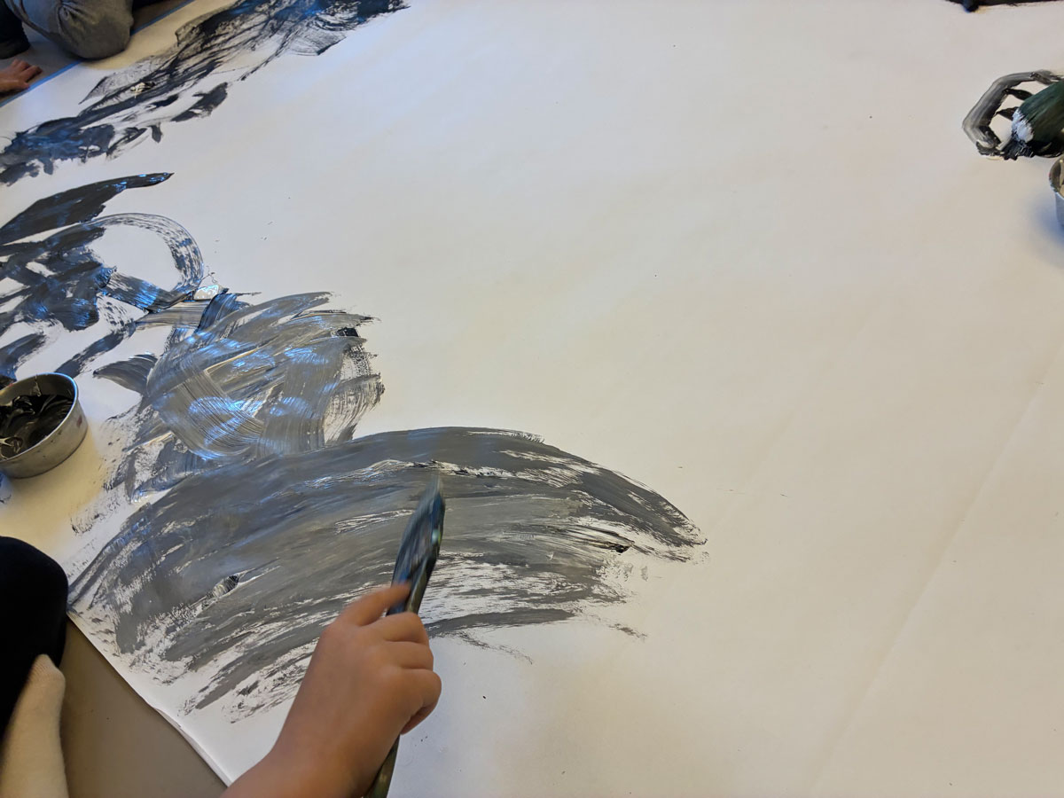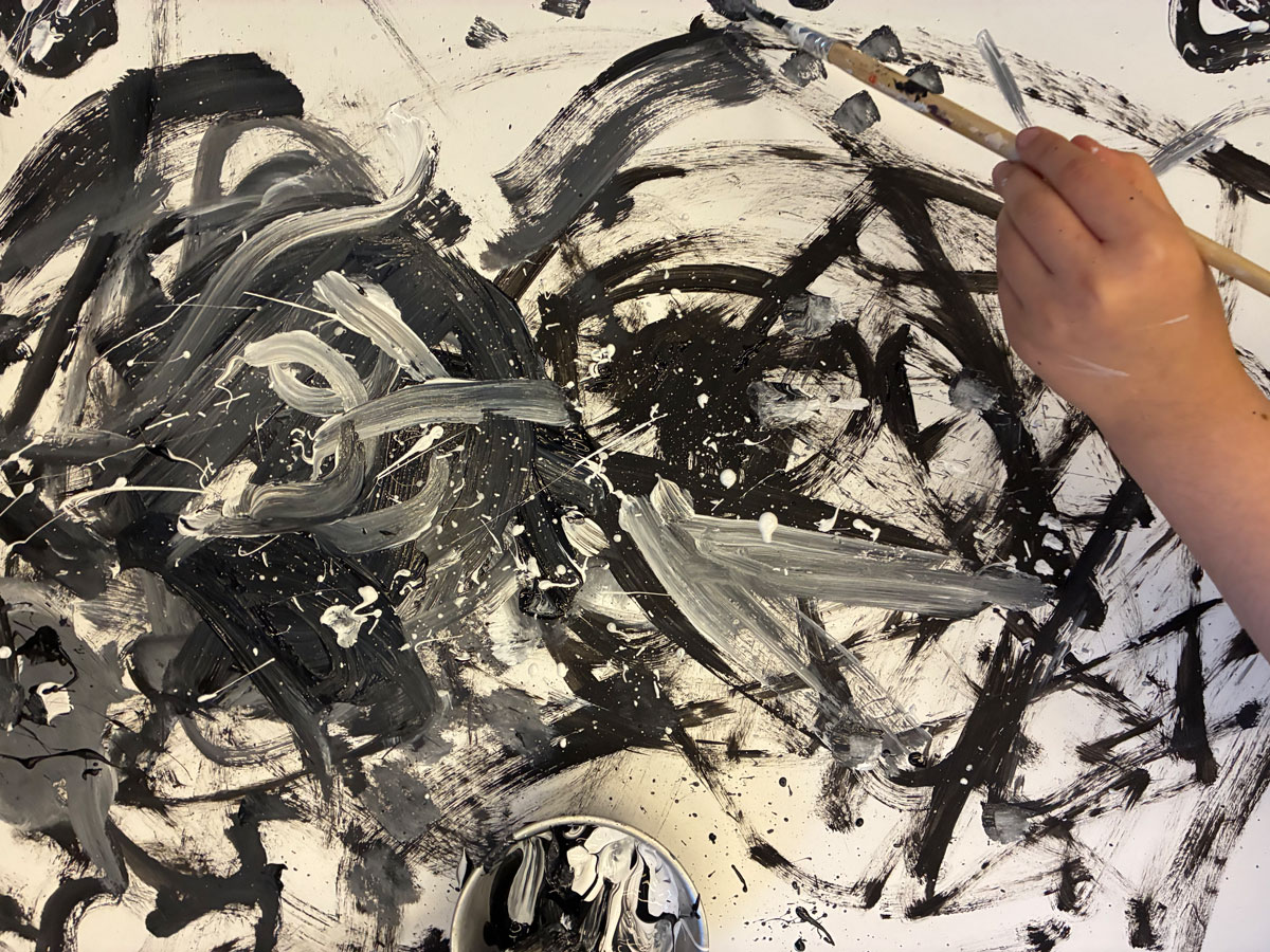 Nach gemeinsamer Betrachtung der realisierten eigenen Roboter-Konstruktionen könnte die Impulsfrage folgende sein: Wie malt mein Roboter? Welche Bewegungen macht er mit seinem Pinsel oder seinem Mal-Instrument? Zur Verfügung werden bewusst ausschließlich Acryl-Farbe in Weiß und Schwarz gestellt, um beim Mischen auch Grautöne im breiten Spektrum zu erlangen und damit zu vermeiden, vorschnell das im Bilderbuch betrachtete Farbzusammenspiel zu kopieren. Sind die Malspuren und Farbbewegungen auf dem Bildträger im Spektrum von Grautönen zwischen Weiß und Schwarz platziert, können weitere Farben angeboten werden, die die Kinder auffordern, im Bewegungs-Farb-Spiel Akzente zu setzen und ins Erzählen zu kommen: Wie hat mein Roboter gemalt? Stell dir vor, du tauchst in das Bild deines Roboters ein wie Pixel – erinnerst du dich, wie Pixel sein Bild mit der Taschenlampe erkundet hat? – Was kannst du entdecken? Welcher Geschichte kommst du auf die Spur? Was ist passiert?