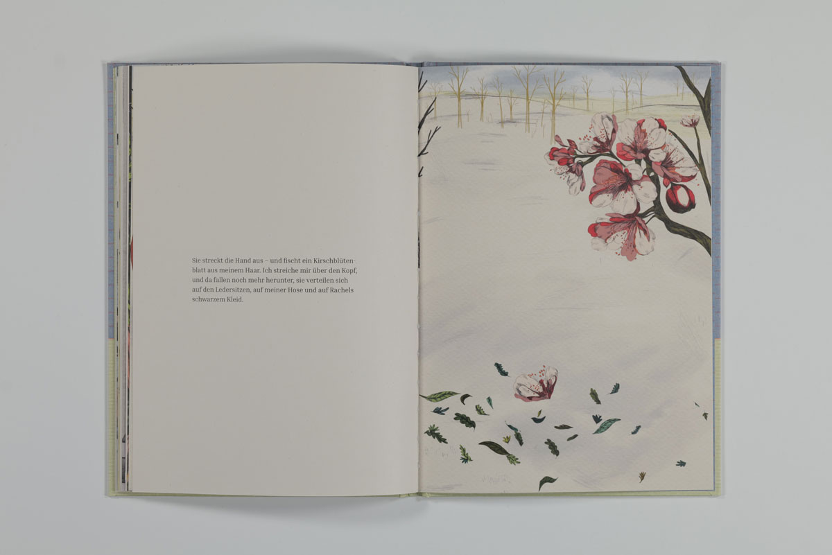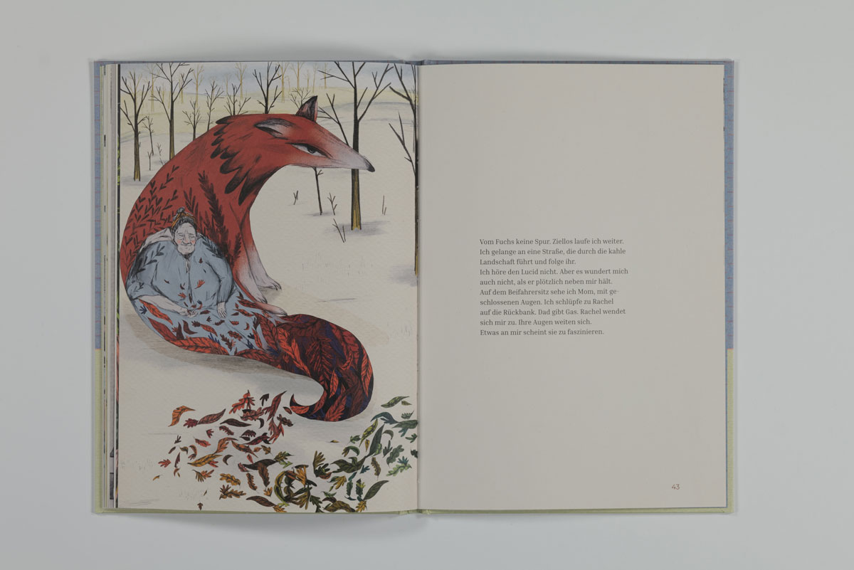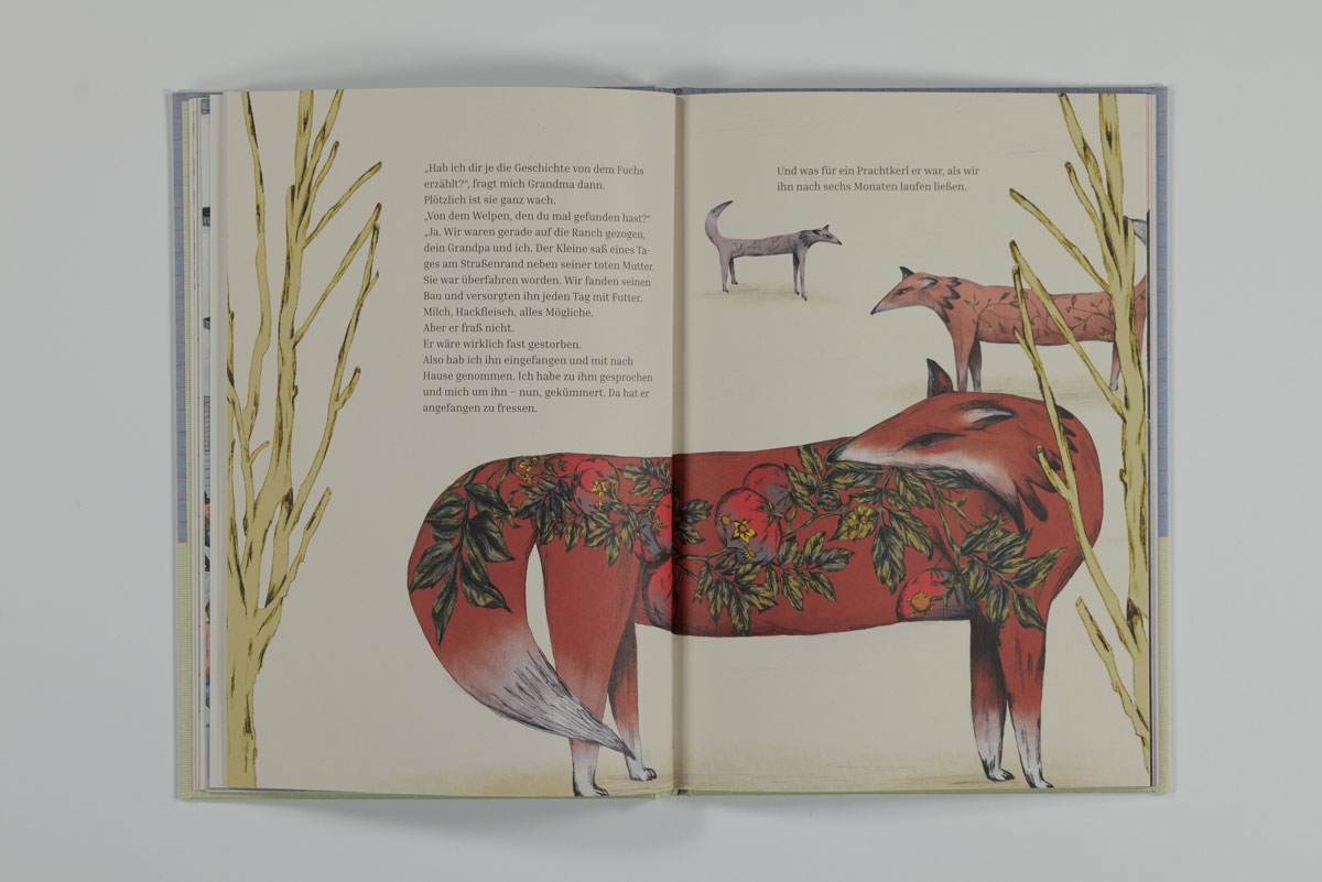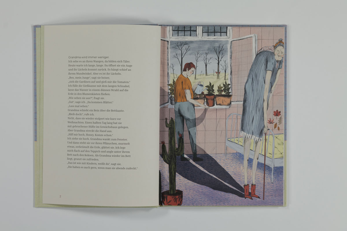 Was passiert mit alten Menschen in einer Welt, in der alle erstarren, sich ausschließlich um ihr unglückliches Selbst drehen, in der es keine Empathie und Zuversicht mehr gibt? Nachdem die Großmutter einen Platz im Pflegeheim verweigert, dessen Name »Shady Acres« für sich spricht, stehen kurz vor ihrem Ableben Mitarbeitende eines Kryokonservierungsinstitut vor der Tür. Nicht nur respektlos, sondern energisch und entschlossen, treten sie den Wunsch der Großmutter, wie das Bild des überdimensionierten Schrittes eines Mannes in graublauem Anzug und Hut aus der Froschperspektive symbolisiert, »mit den Füßen«. Wie gut, dass die Großmutter Ben hat. Und wie schön, dass Ben sich auf Rachel verlassen kann. Denn Rachel hat schon vor einiger Zeit vom Fenster aus dabei zugesehen, wie Ben und seine ›Grandma‹ Blätter nach Farben sortiert und im Anschluss ein Wettschießen mit Pfeil und Bogen veranstaltet haben, bei der die Ältere wie selbstverständlich gewann. Obwohl Rachel erst die vierte Klasse besucht, hat sie sehr genau verstanden, welche Bedeutung die Großmutter für Ben im Besonderen aber auch im Sinne eines Vorbildes für uns ALLE haben könnte und bietet ihm ihre Hilfe an. Eine große Unterstützung, den Schmerz über den Tod seiner Großmutter zu verarbeiten, ist auch der Fuchs. Zu Lebzeiten hat die Großmutter diesen als verwaisten Welpen aufgezogen, sich solange liebevoll um ihn gekümmert bis er stark genug war, ausgewildert zu werden. Für die Zuwendung, die die Großmutter für ihre Pflanzen im Gewächshaus wie für das verwundete Tier gleichermaßen aufbringt, entwickelt Kerstin Marie Backes die wundervolle Bildidee eines Fuchses, dessen Fell – wie durch Zauberei – zunehmend wachsend Tomatenpflanzen zieren. Der Fuchs steht demnach nicht nur für das Leben, sondern verkörpert als Zwischenwesen die Großmutter. In dem Moment, in dem Ben der Tod der Großmutter unwiderruflich bewusstwird, und er fest davon überzeugt ist, ganz allein zu sein und es nie wieder Frühling werden wird, nimmt er den Fuchs wahr. Er folgt ihm in eine Welt, die schon lange verschwunden und vergessen war. »Farben! Endlich wieder. Grüne Blätter. Und Blumen. Azaleen, Goldenrod, Löwenzahn … Grandma kannte sie alle, …«. Endlich kann er Abschied nehmen und sich Rachel zuwenden, die auf dem Weg zur Beerdigung neben ihm im Auto sitzend, ein Kirschblütenblatt aus seinem Haar zupft. Ist das Kirschblütenblatt in der Schlussszene als ein Relikt der traumartigen Abschiedsbegegnung mit der Großmutter zu verstehen, symbolisiert es gleichzeitig Aufbruch und Hoffnung und stellt auf diese Weise für Ben und Rachel den Beginn einer neue Lebensphase dar.