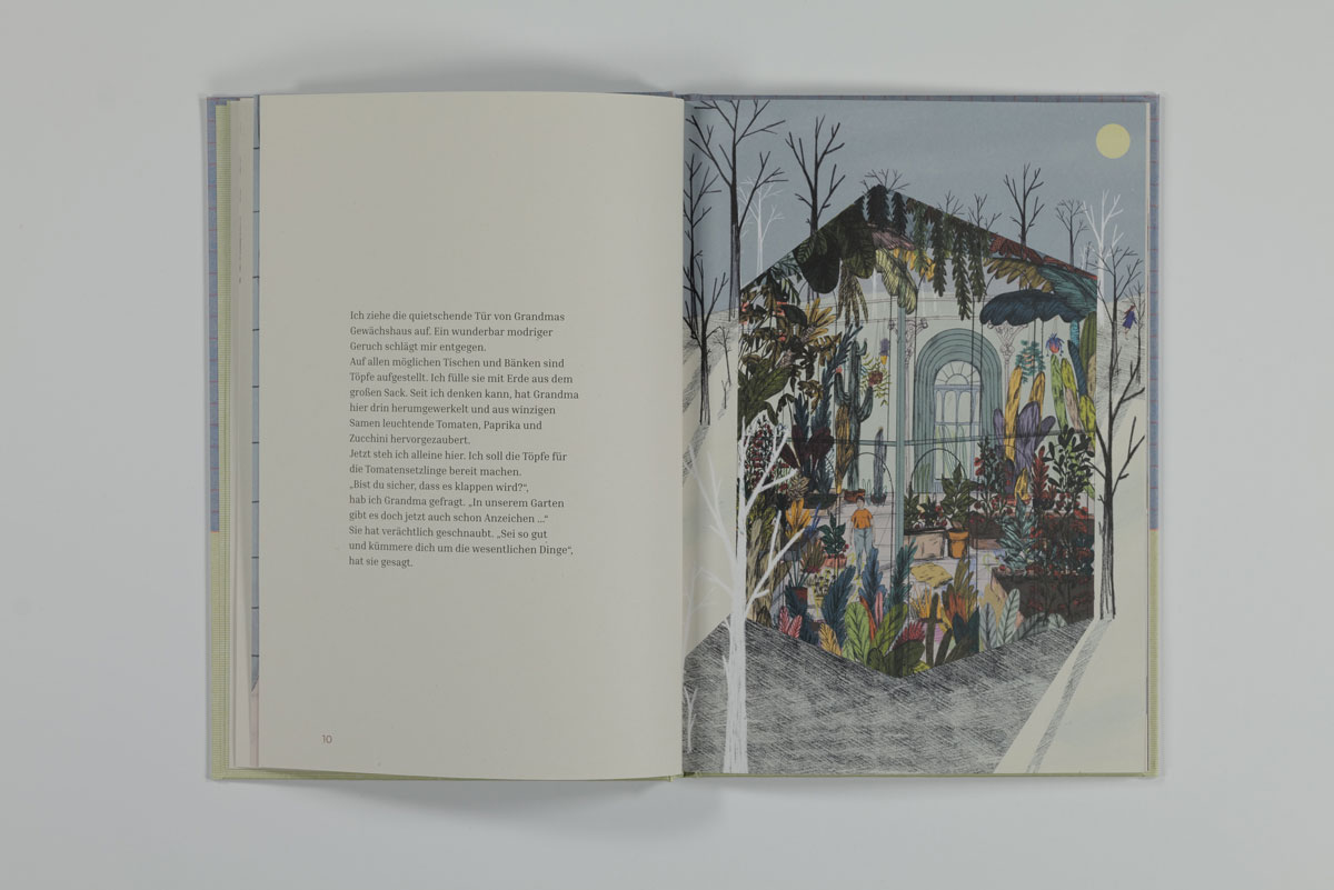 »Nie wieder Frühling« ist eine dystopische Geschichte, die Sarah Knausenberger meisterhaft aus der Perspektive von Ben erzählt und Kerstin Marie Backes mit kolorierten Zeichnungen wie Collagekunst kongenial ins Bild setzt. Ihre Bilder spielen dabei mit Perspektivwechseln und Kontrasten zwischen Innen und Außen, der lebendigen Welt der Großmutter, in der Pflanzen gedeihen und der stumpfen wie farblosen Außenwelt, für die es keine Jahreszeiten mehr gibt.
